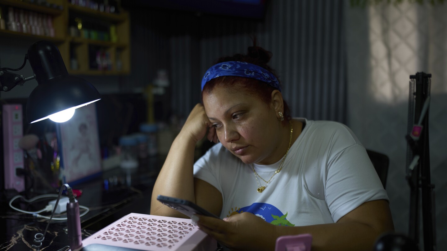Syntia Caceres will record a video to post on social media about her son who was detained in the US in July and later Caracas, Venezuela, September 4, and her 4-year-old granddaughter, Auror, who became foster parents on Thursday, September 4, 2025 (AP Photo/Ariana Cubilos)